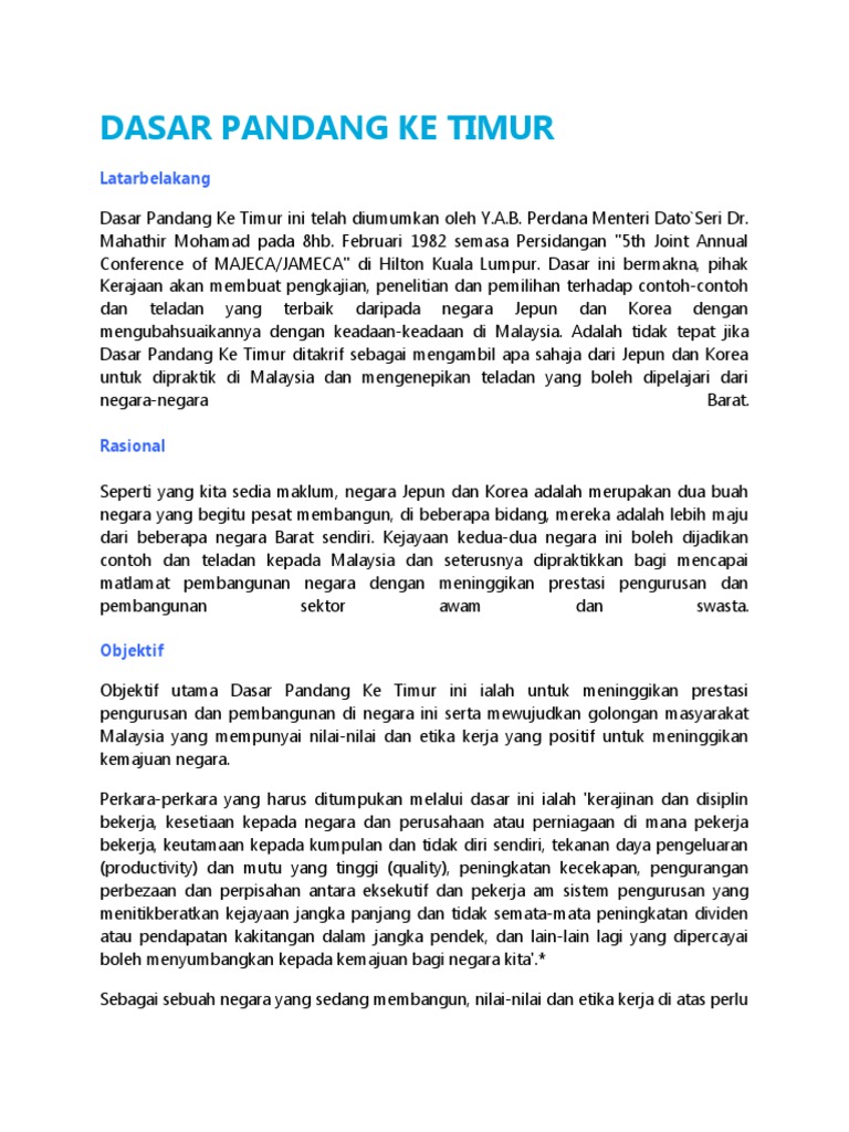 Dimensi Baharu Dasar Pandang Timur from assets.bharian.com.my M sunggio 1 month ago. · dasar pandang ke timur. Nur angriani binti nurja yang menyuruh kami membuat blog ini yang bertajuk dasar pandang ke timur.yang terakhir,setinggi penghargaan kepada kementerian pendidikan malaysia yang menyediakan rujukan iaitu buku. .pandang ke timur semasa pentadbiran tun dr. · mengimbangkan teknologi canggih dan etika kerja yang positif. Dokumen bertulis oleh mahkamah yang mewajibkan seseorang untuk hadir ke mahkamah pada masa tarikh yang ditetapkan. • melalui dasar ini, kerajaan akan membuat kajian, penelitian dan pemilihan contoh dan teladan yang terbaik dari jepun serta korea selatan dan kemudian mengubahsuaikannya dengan keadaan di. Pengenalan dasar pandang ke timur.