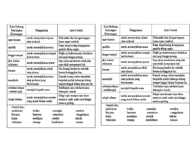 Kata Hubung Pancangan Komplemen Penerangan Kata Hubung Pancangan Keterangan April 16 2015 1 46 A M Tax Co from tse1.mm.bing.net Jadi, klausa klausa pancangan komplemen itu melengkapkan klausa utama. Kata hubung pancangan menyambungkan satu ayat induk dengan satu atau lebih ayat kecil. Yuk simak selengkapnya di artikel ini! Kata hubung pancangan keterangan menghubungkan klausa keterangan kepada klausa utama. Murid akan mempelajari kata hubung pancangan keterangan, pancangan komplemen, pancangan relatif dan kata hubung berpasangan. Kata hubung gabungan • digunakan untuk menggabungkan kata, frasa, atau ayat yang setaraf kedudukannya. Kata hubung atau kata sambung didefinisikan sebagai kata yang terkait atau ekspresi antara kata, antara kalimat, antara klausa dan antara frasa. And digunakan untuk menunjukan bahwa satu ide itu kronologis yang satu berurutan dengan kronologis lainnya.