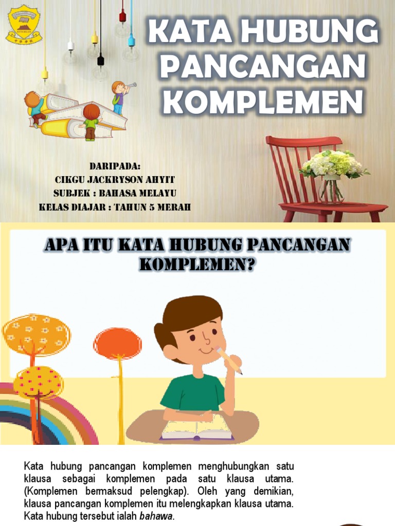 Kata Hubung Pancangan Komplemen : Latihan Kata Hubung Pancangan Keterangan - ~kata hubung pancangan terbahagi kepada tiga pancangan keterangan ii) kata hubung pancangan relatif iii) kta hubung pancangan komplemen.. Video ini membantu guru dan murid dalam melaksanakan pdpc di dalam kelas dan juga secara maya.semua kandunga termasuk nota dan latihan pelbagai aras telah. Kata hubung digunakan untuk membangun sebuah kalimat. Informasi bahasa kata hubung pancangan komplemen dan relatif kata hubung pancangan komplemen dan kata hubung pancangan relatif tidak boleh bertukar ganti dalam ayat. ~kata hubung pancangan terbahagi kepada tiga pancangan keterangan ii) kata hubung pancangan relatif iii) kta hubung pancangan komplemen. Kata hubung pancangan menyambungkan satu ayat induk dengan satu atau lebih ayat kecil.