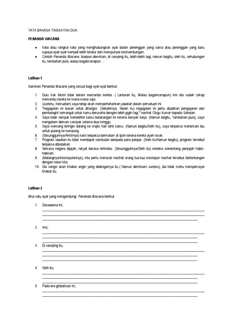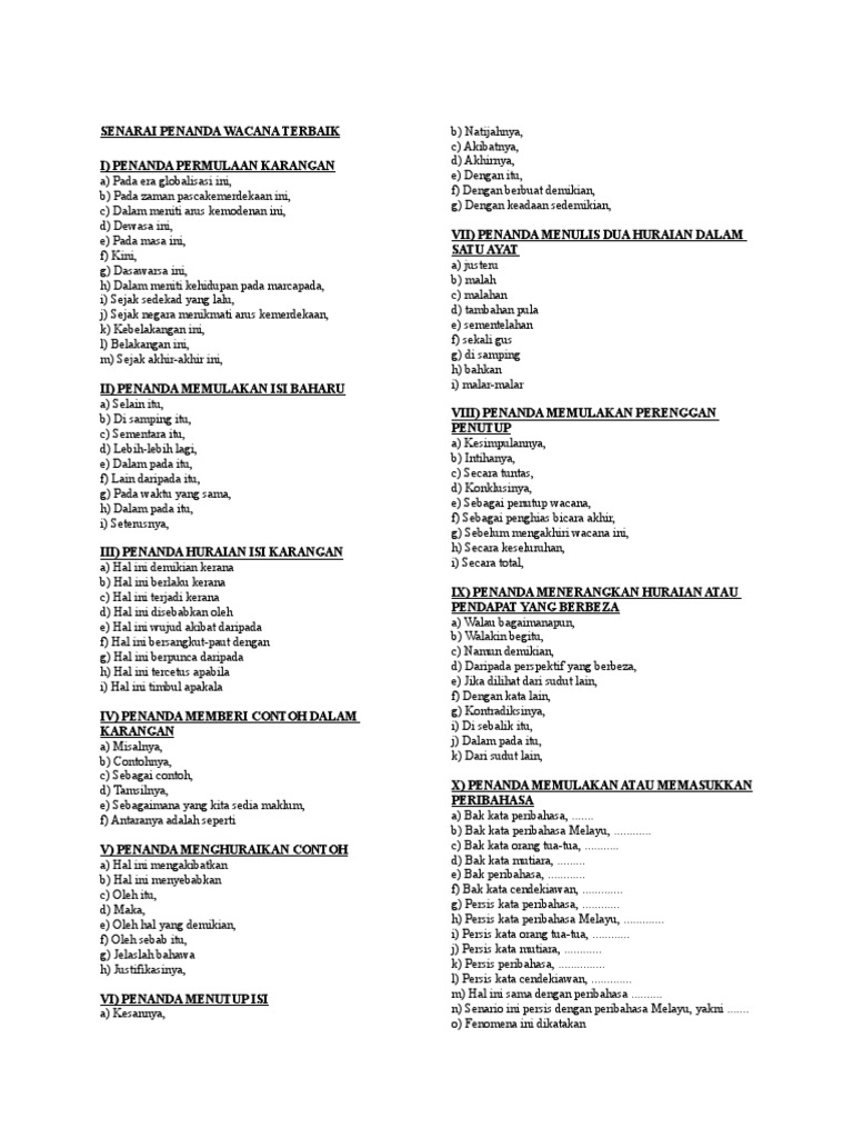 Koleksi Penanda wacana dan Bahasa Gramatis from img.pdfslide.net Cikgu zainudin(zbd_zd@yahoo.com) 35 penanda wacana menarik / tepat. Cikgu zainudin(zbd_zd@yahoo.com) 36 penanda wacana penanda wacana merupakan perangkai ayat untuk menentukan perkaitan atau kesinambungan antara satu idea dengan satu idea yang lain dalam ayat atau perenggan. Penanda wacana digunakan untuk menulis ringkasan dan pemahaman, karangan. I) penanda wacana untuk memulakan karangan 1.